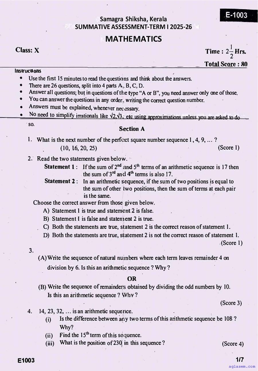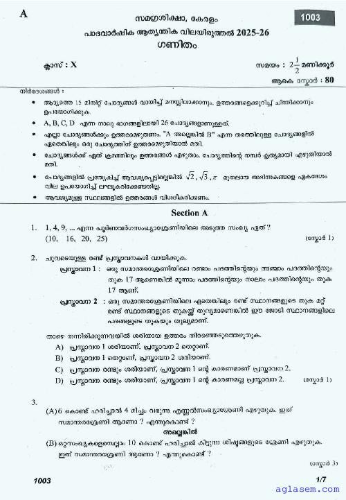 Class 10 Maths Onam Exam Question Paper 2026 is published after exam. You can download the Kerala Std 10 First Term Maths Question Paper PDF from here on aglasem. The latest and previous year question paper of Onam Exam for class 10 Maths helps you prepare for the upcoming first term Maths test. And after studying with this Kerala Syllabus SSLC Maths Question Paper, you can download Onam Exam Question Paper for Class 10 for other subjects as well.