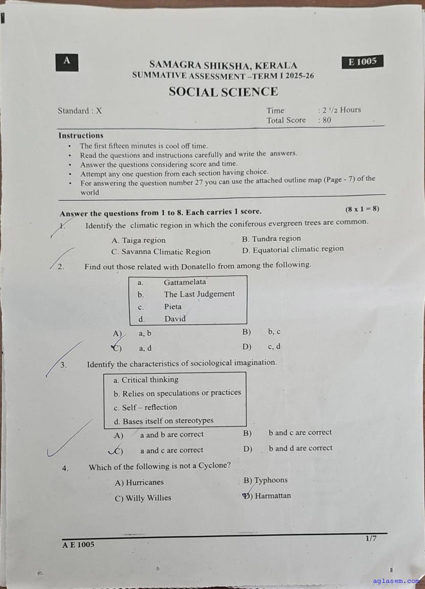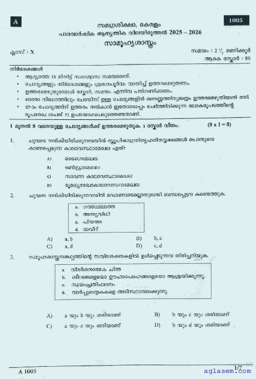 Class 10 Social Science Onam Exam Question Paper 2026 is published after exam. You can download the Kerala Std 10 First Term Social Science Question Paper PDF from here on aglasem. The latest and previous year question paper of Onam Exam for class 10 Social Science helps you prepare for the upcoming first term Social Science test. And after studying with this Kerala Syllabus SSLC Social Science Question Paper, you can download Onam Exam Question Paper for Class 10 for other subjects as well.
