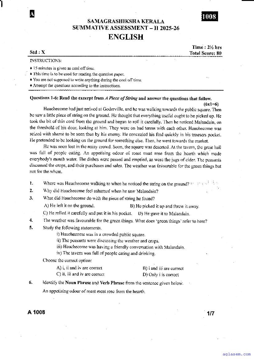 Class 10 English Christmas Exam Question Paper 2026 is published after the exam. You can download the Kerala Std 10 Second Term English Question Paper PDF from Aglasem. The latest and previous year question paper of Christmas Exam for class 10 English helps you prepare for the upcoming Second Term English test. After studying with this Kerala Syllabus SSLC English Question Paper, you can download Christmas Exam Question Paper for Class 10 for other subjects as well.
