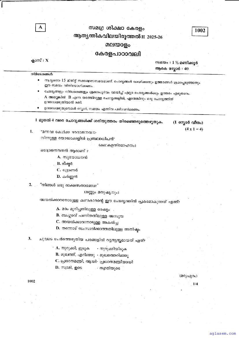 Class 10 Malayalam I Christmas Exam Question Paper 2026 is published after the exam. You can download the Kerala Std 10 Second Term Malayalam I Question Paper PDF from Aglasem. The latest and previous year question paper of Christmas Exam for class 10 Malayalam I helps you prepare for the upcoming Second Term Malayalam I test. After studying with this Kerala Syllabus SSLC Malayalam I Question Paper, you can download Christmas Exam Question Paper for Class 10 for other subjects as well.