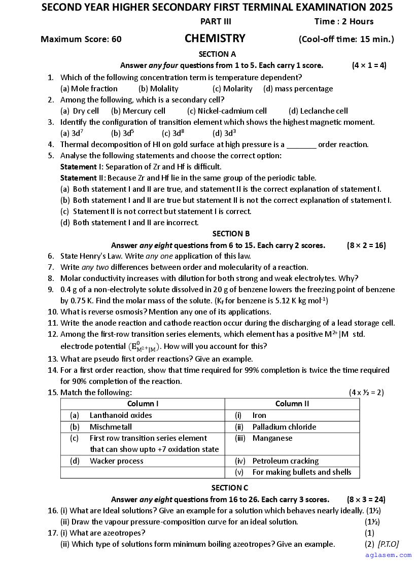 Kerala Class 11 First Term Question Paper 2025 Chemistry View Download