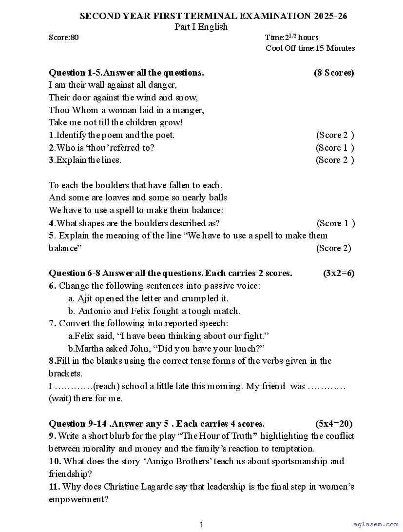 Class 11 English Onam Exam Question Paper 2026 is published after exam. You can download the Kerala Std 11 First Term English Question Paper PDF from here on aglasem. The latest and previous year question paper of Onam Exam for class 11 English helps you prepare for the upcoming first term English test. And after studying with this Kerala Syllabus Plus One English Question Paper, you can download Onam Exam Question Paper for Class 11 for other subjects as well.