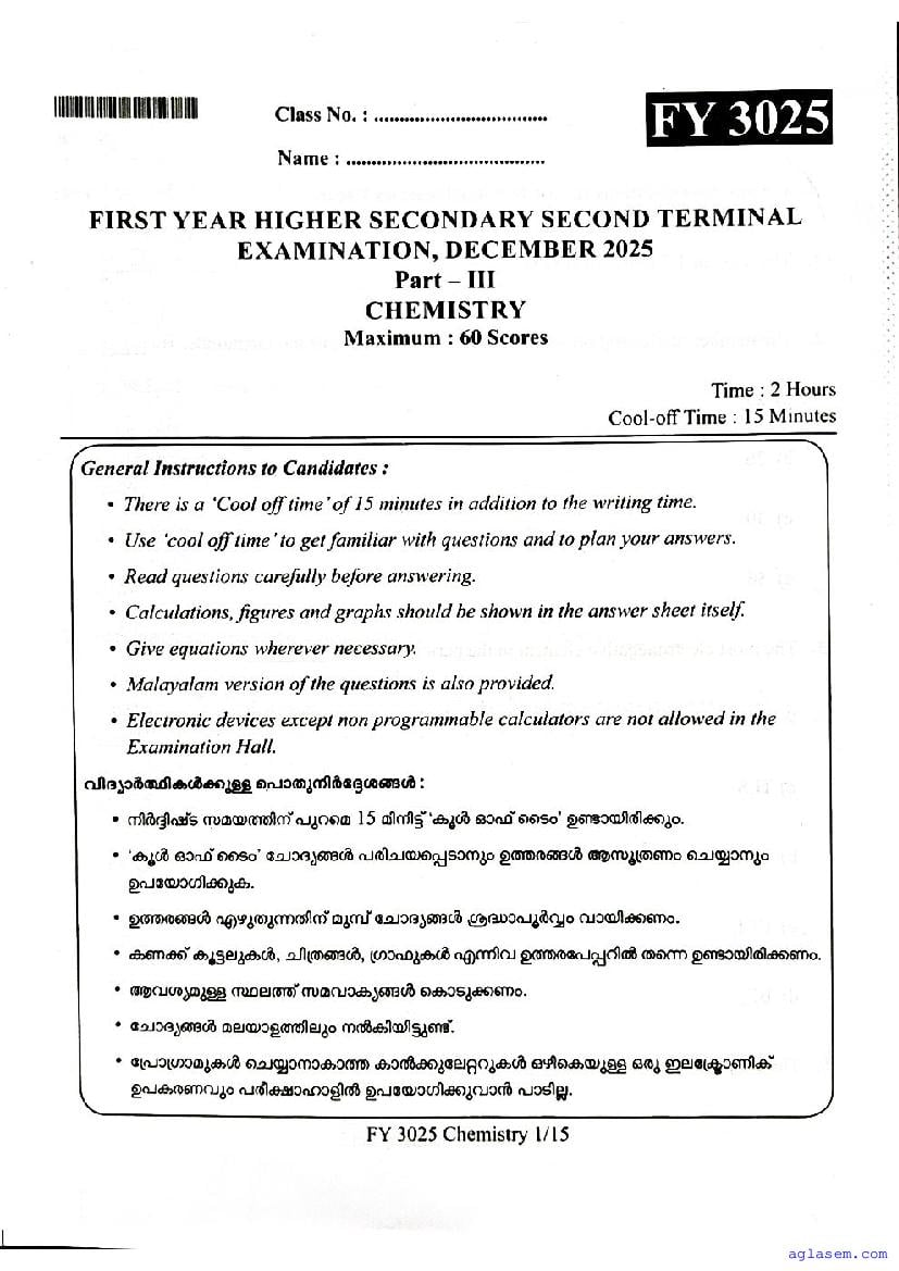 Class 11 Chemistry Christmas Exam Question Paper 2026 is published after the exam. You can download the Kerala Std 11 Second Term Chemistry Question Paper PDF from Aglasem. The latest and previous year question paper of Christmas Exam for class 11 Chemistry helps you prepare for the upcoming Second Term Chemistry test. After studying with this Kerala Syllabus Plus One Chemistry Question Paper, you can download Christmas Exam Question Paper for Class 11 for other subjects as well.