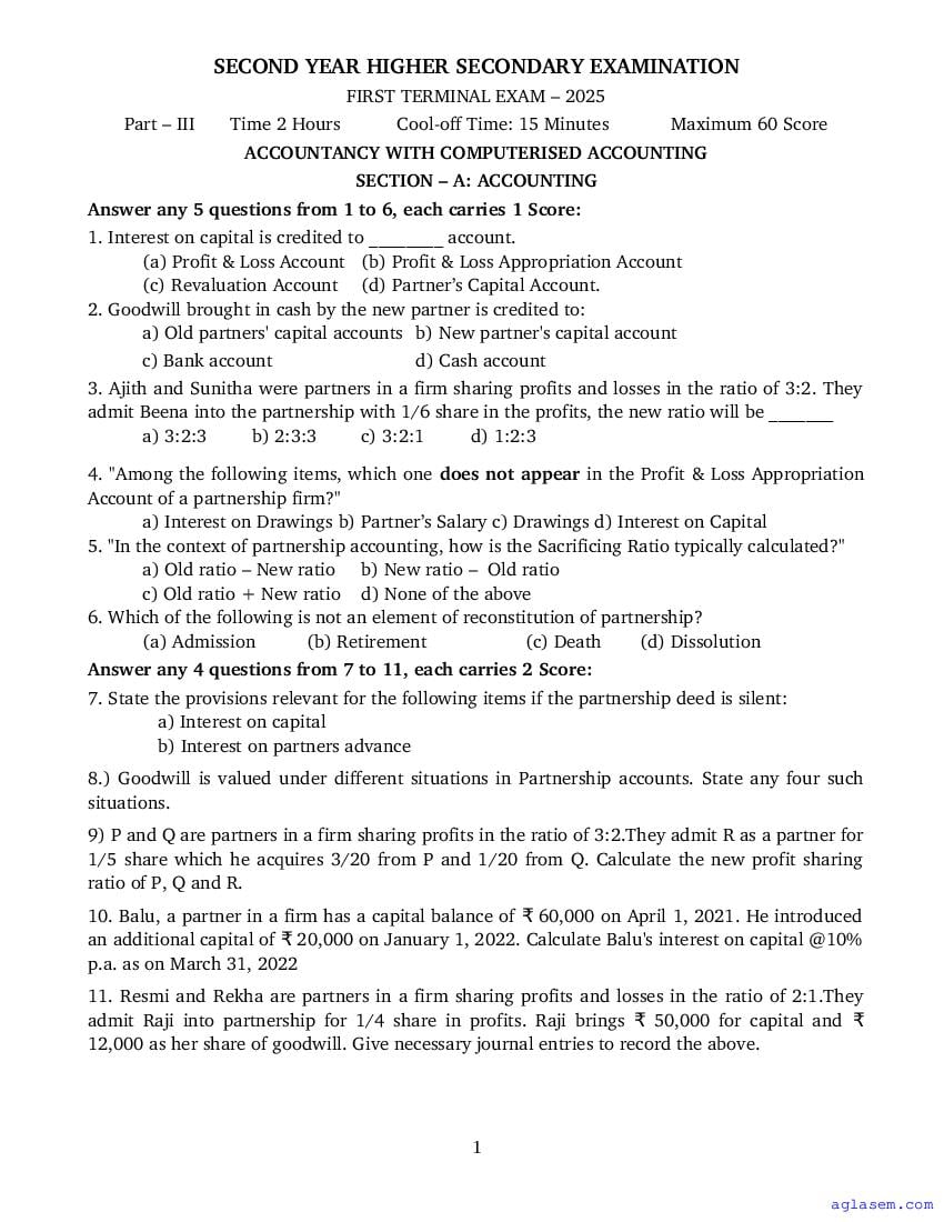 | Paper Here | Kerala Class 12 First Terminal Exam Accountancy CA Question Paper |