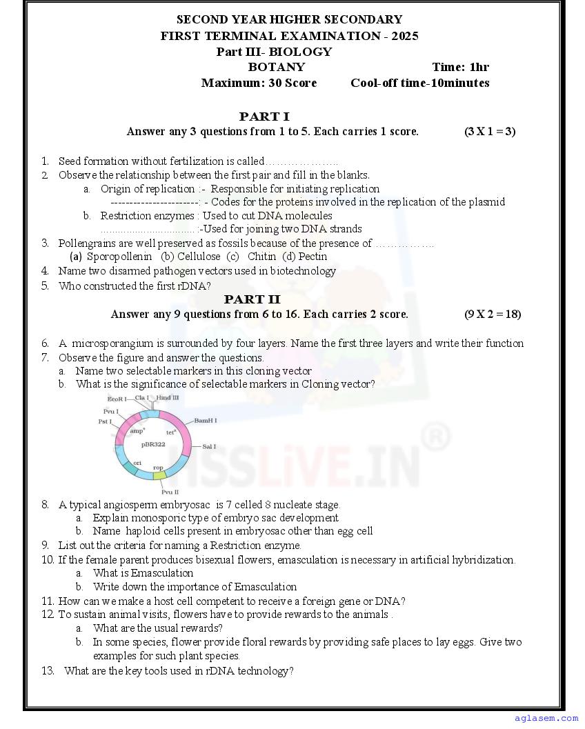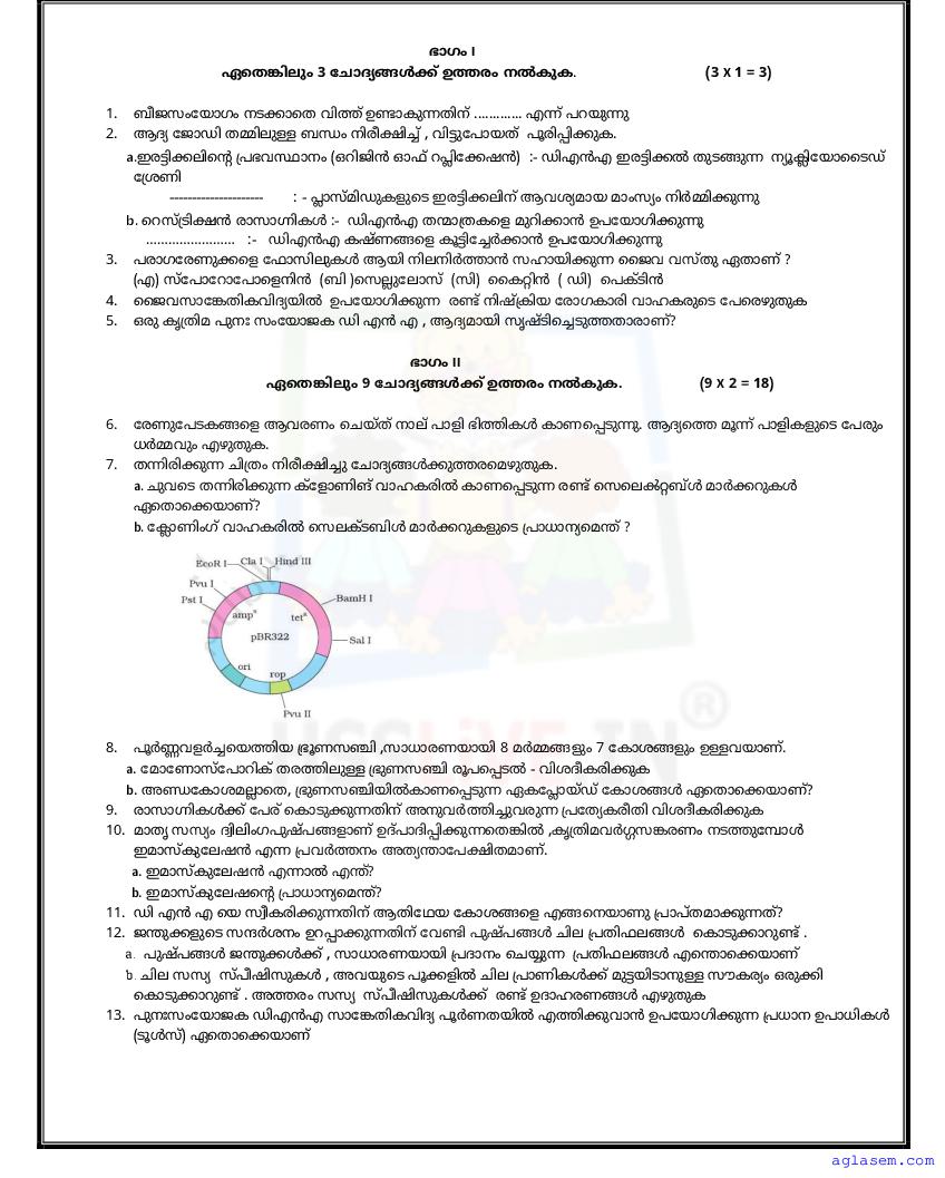 Class 12 Biology Onam Exam Question Paper 2026 is published after exam. You can download the Kerala Std 12 First Term Biology Question Paper PDF from here on aglasem. The latest and previous year question paper of Onam Exam for class 12 Biology helps you prepare for the upcoming first term Biology test. And after studying with this Kerala Syllabus Plus Two Biology Question Paper, you can download Onam Exam Question Paper for Class 12 for other subjects as well.