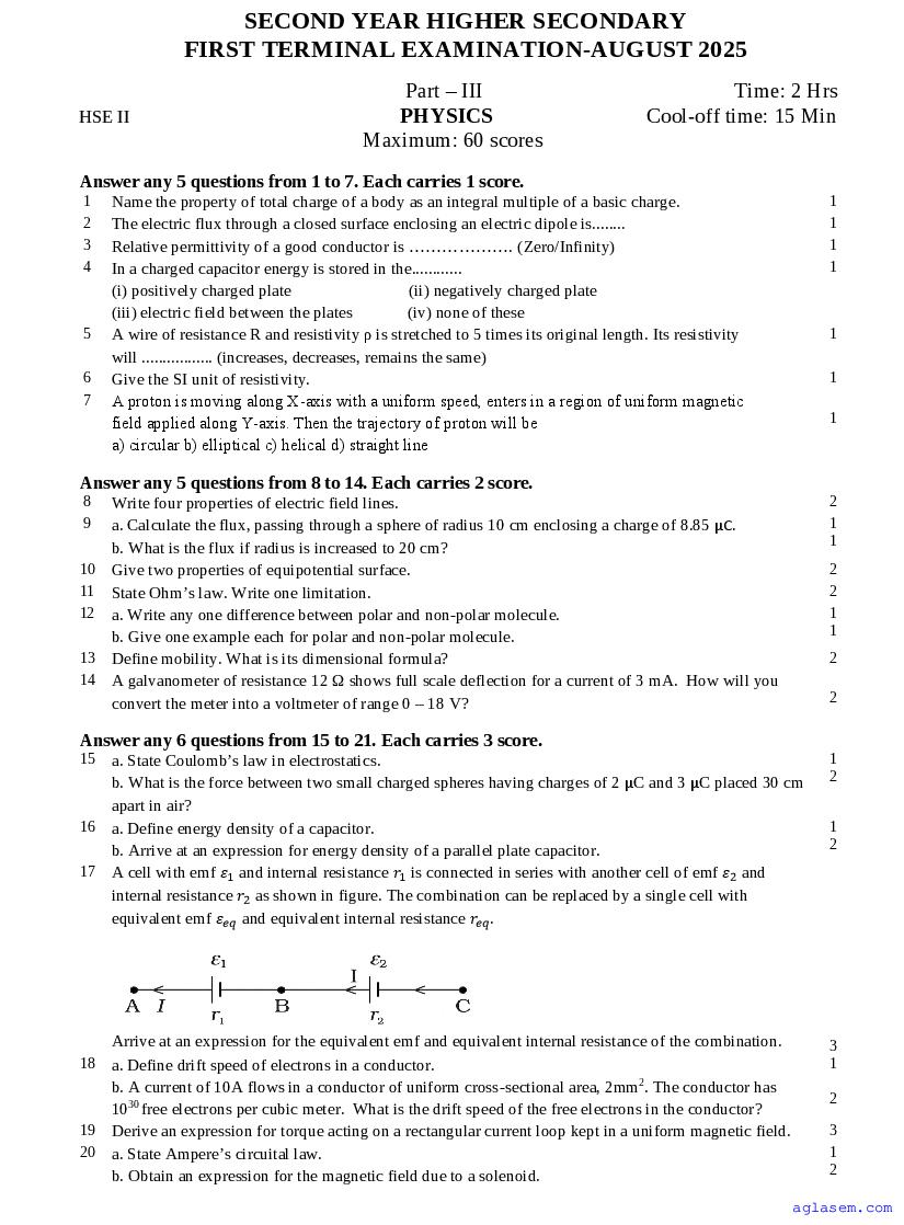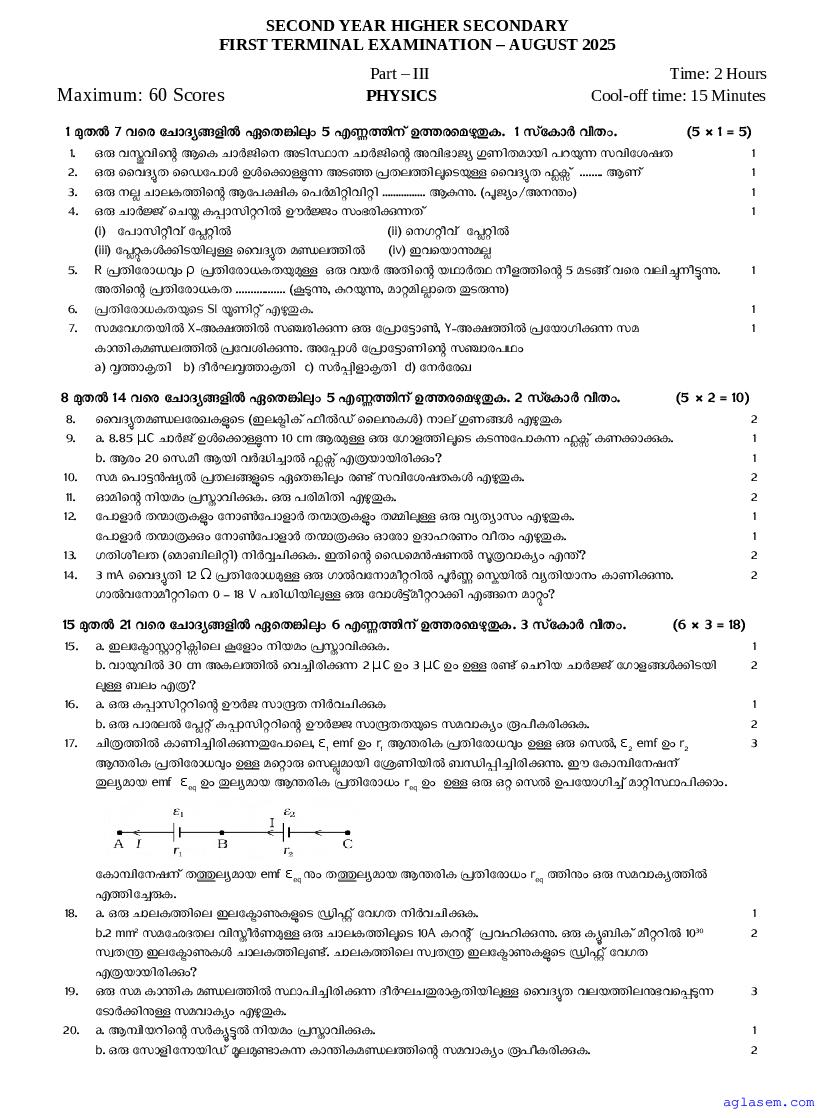 Class 12 Physics Onam Exam Question Paper 2026 is published after exam. You can download the Kerala Std 12 First Term Physics Question Paper PDF from here on aglasem. The latest and previous year question paper of Onam Exam for class 12 Physics helps you prepare for the upcoming first term Physics test. And after studying with this Kerala Syllabus Plus Two Physics Question Paper, you can download Onam Exam Question Paper for Class 12 for other subjects as well.