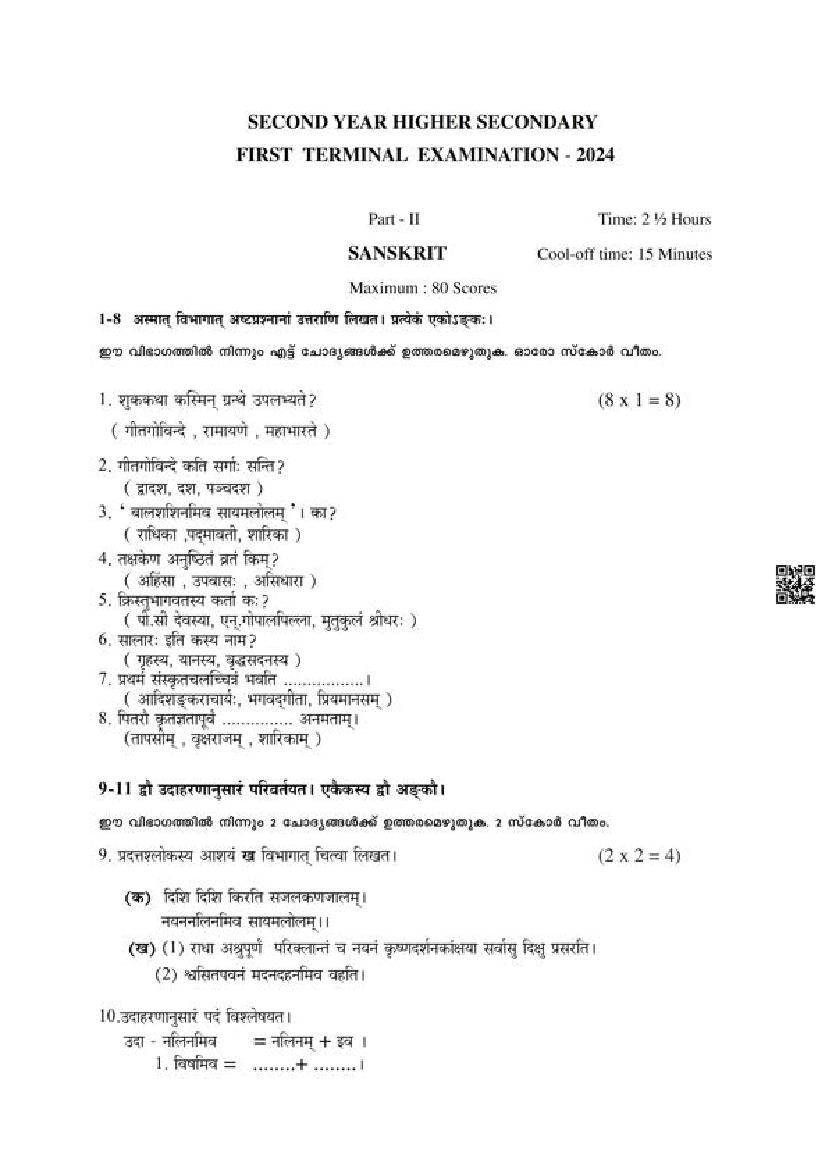 Kerala Class 12 First Term Question Paper 2024 Sanskrit View Download