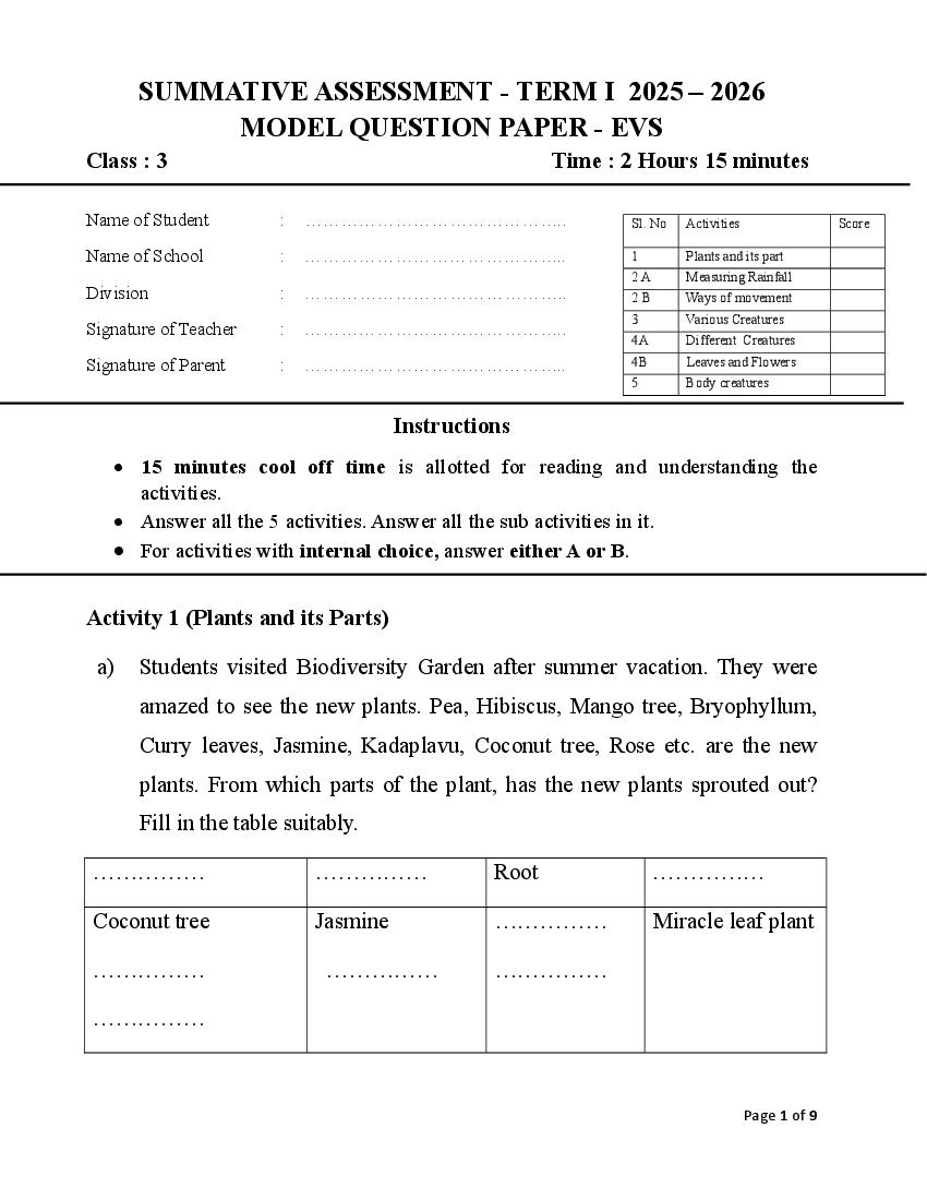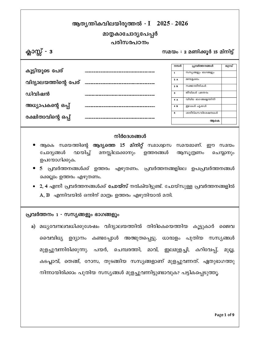 - Kerala Class 3 EVS Model Paper 2026