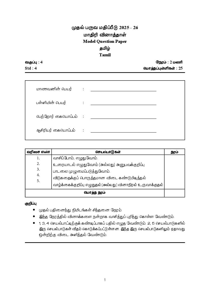 This is the latest model question paper for Std 4 Tamil Onam Exam 2026. Students should practice this paper to get familiar with the exam format.