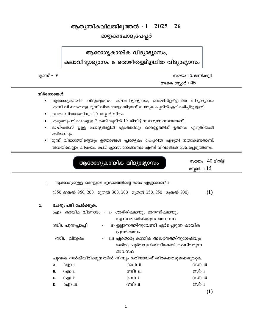 Kerala Class 5 First Term Model Question Paper 2025 Health & Physical Education, Art Education, and Work Integrated Education View Download