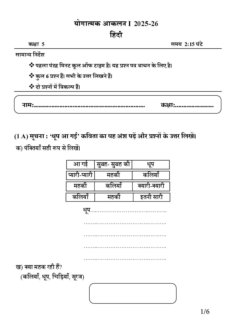 Students can download the Class 5 Hindi First Term Exam Model Question Paper 2026 PDF and practice regularly to improve their exam performance.