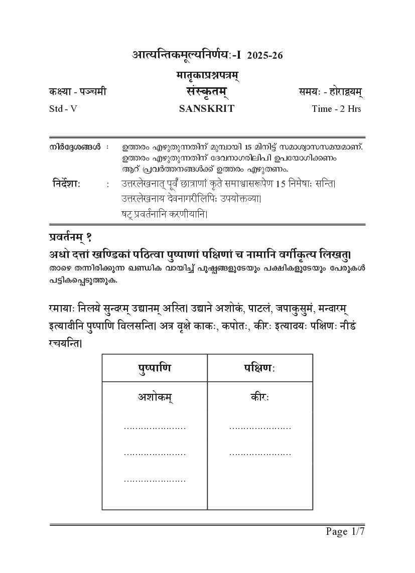 - Class 5 Sanskrit Onam Exam Practice Paper