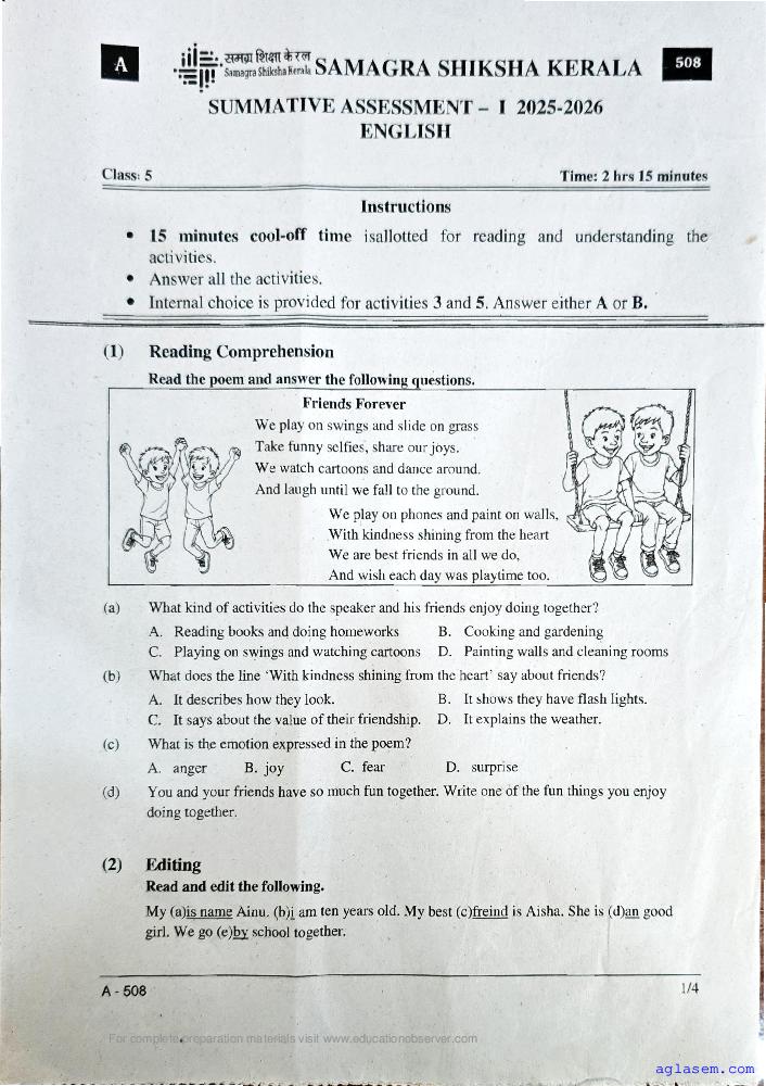| Paper Here | Kerala Class 5 First Terminal Exam English Question Paper |