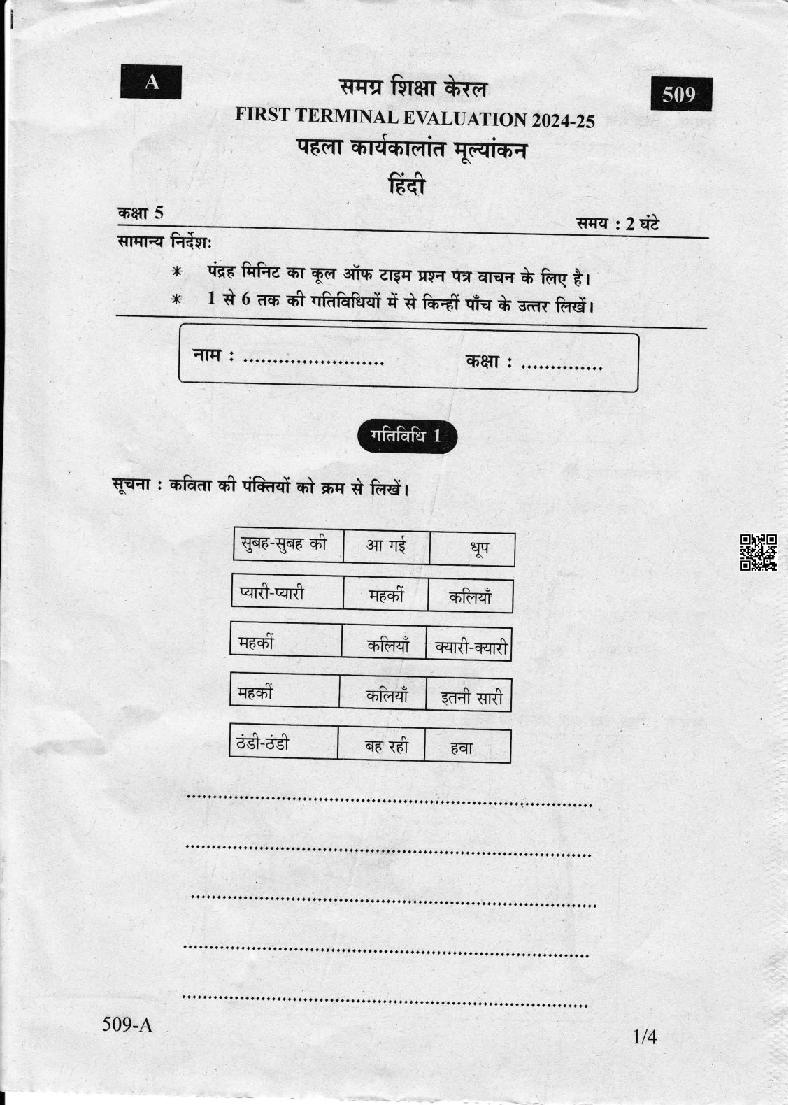 Kerala Class 5 First Term Question Paper 2024 Hindi View Download
