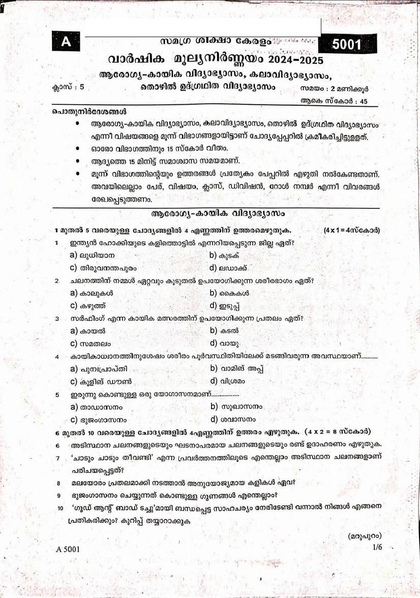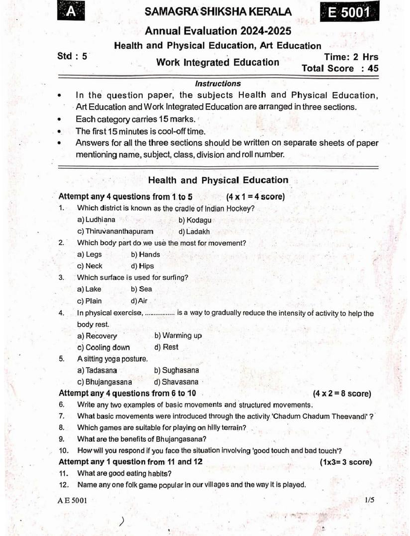 Kerala Class 5 Health and Physical Education, Art Education, Work Education Question Paper 2025