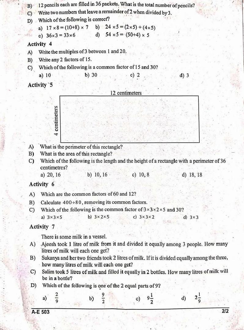The Kerala Syllabus Question Papers for class 5th Class 5 Maths is as follows.