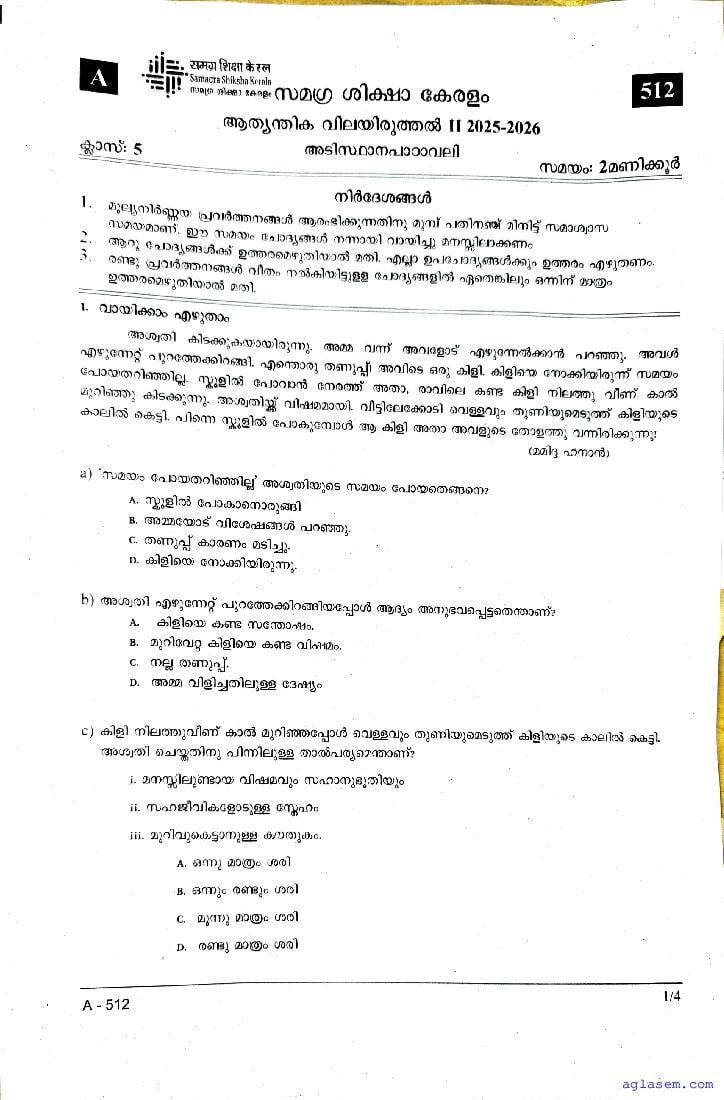 Class 5 Malayalam II Christmas Exam Question Paper 2026 is published after the exam. You can download the Kerala Std 5 Second Term Malayalam II Question Paper PDF from Aglasem. The latest and previous year question paper of Christmas Exam for class 5 Malayalam II helps you prepare for the upcoming Second Term Malayalam II test. After studying with this Kerala Syllabus 5th Standard Malayalam II Question Paper, you can download Christmas Exam Question Paper for Class 5 for other subjects as well.
