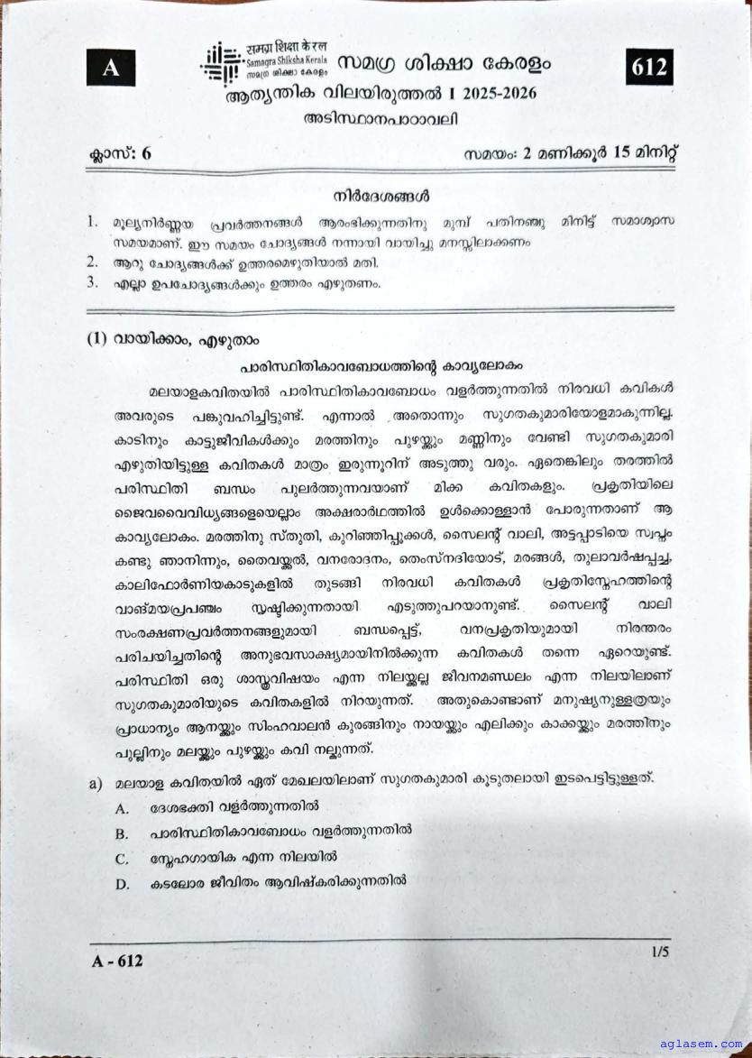 | Paper Here | Kerala Class 6 First Terminal Exam Malayalam II Question Paper |