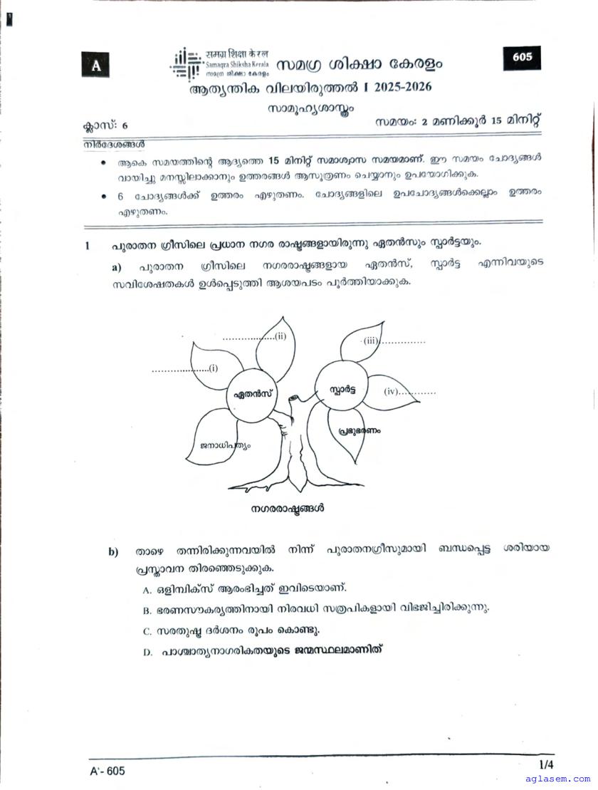 Class 6 Social Science Onam Exam Question Paper 2026 is published after exam. You can download the Kerala Std 6 First Term Social Science Question Paper PDF from here on aglasem. The latest and previous year question paper of Onam Exam for class 6 Social Science helps you prepare for the upcoming first term Social Science test. And after studying with this Kerala Syllabus 6th Standard Social Science Question Paper, you can download Onam Exam Question Paper for Class 6 for other subjects as well.