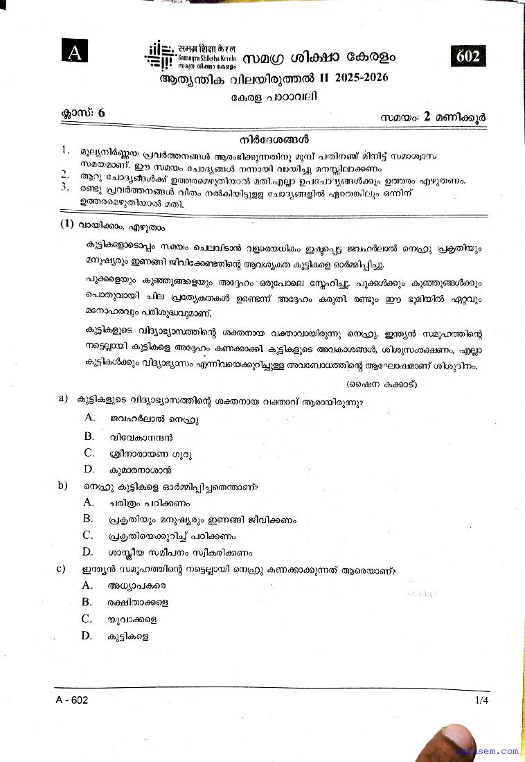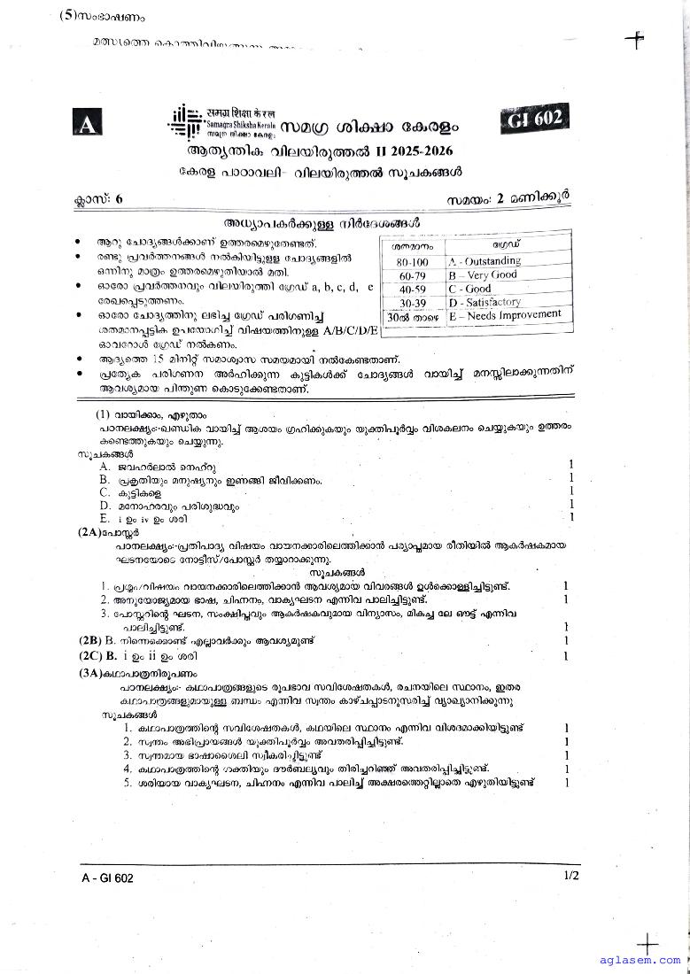 | Paper Here | Kerala Class 6 Second Terminal Exam Malayalam I Question Paper |