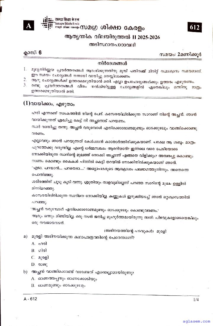 Class 6 Malayalam II Christmas Exam Question Paper 2026 is published after the exam. You can download the Kerala Std 6 Second Term Malayalam II Question Paper PDF from Aglasem. The latest and previous year question paper of Christmas Exam for class 6 Malayalam II helps you prepare for the upcoming Second Term Malayalam II test. After studying with this Kerala Syllabus 6th Standard Malayalam II Question Paper, you can download Christmas Exam Question Paper for Class 6 for other subjects as well.