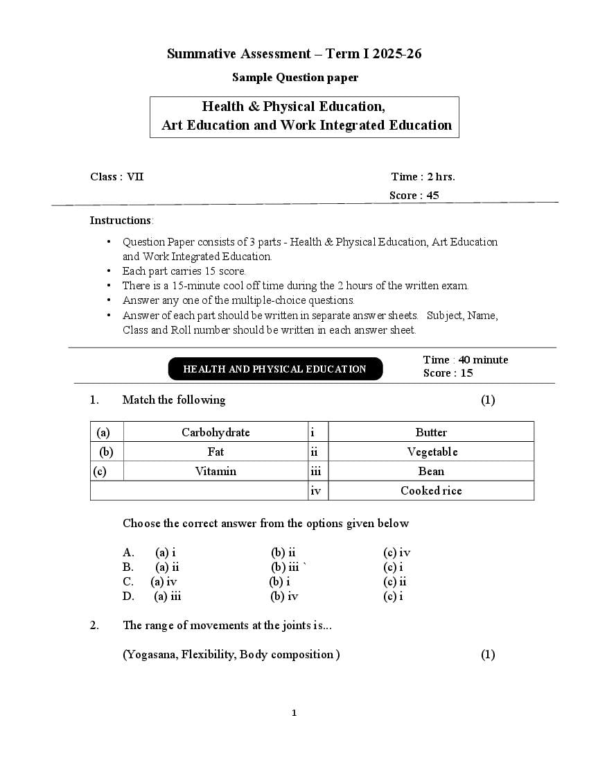 This is the latest model question paper for Std 7 Health & Physical Education, Art Education, and Work Integrated Education Onam Exam 2026. Students should practice this paper to get familiar with the exam format.