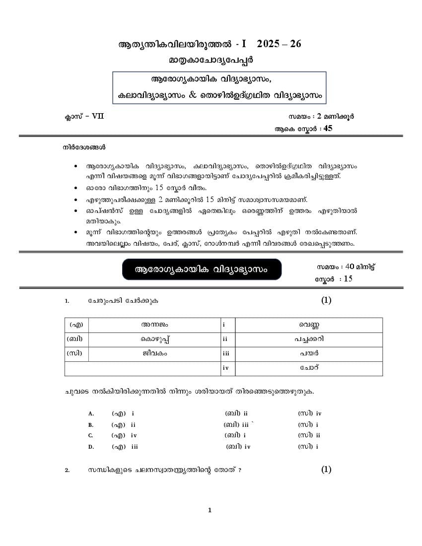 Kerala Class 7 First Term Model Question Paper 2025 Health & Physical Education, Art Education, and Work Integrated Education View Download