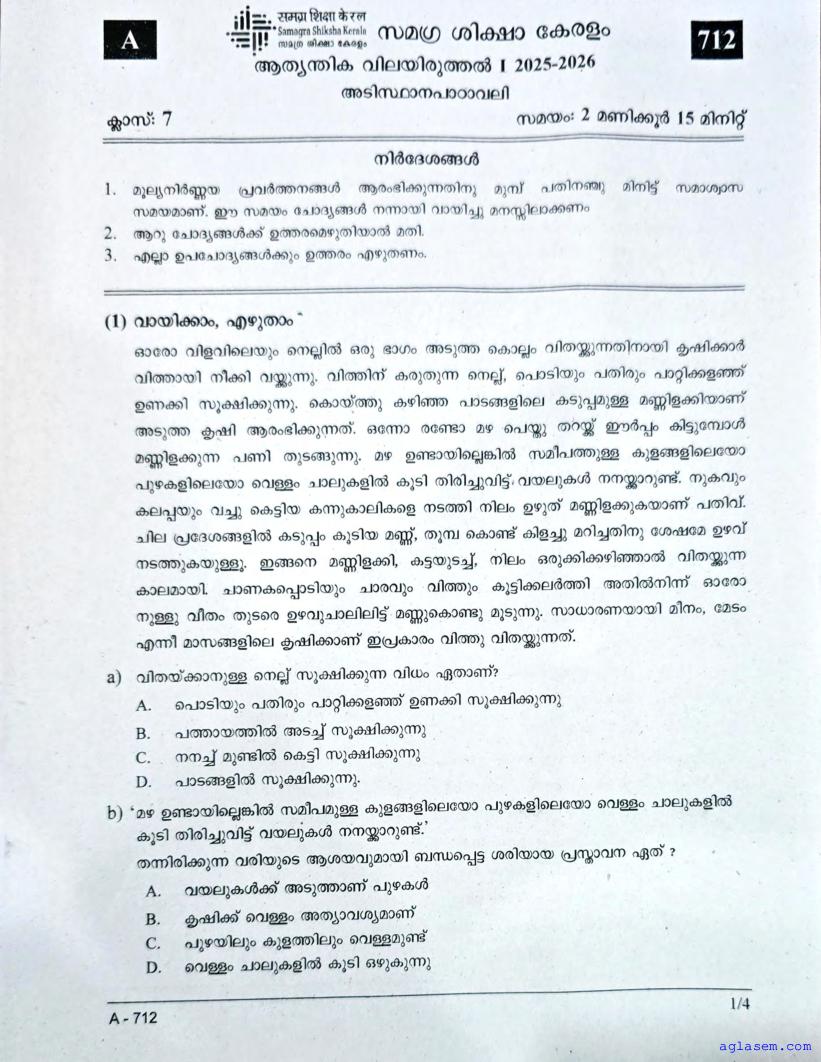 Kerala Class 7 First Term Question Paper 2025 Malayalam I View Download