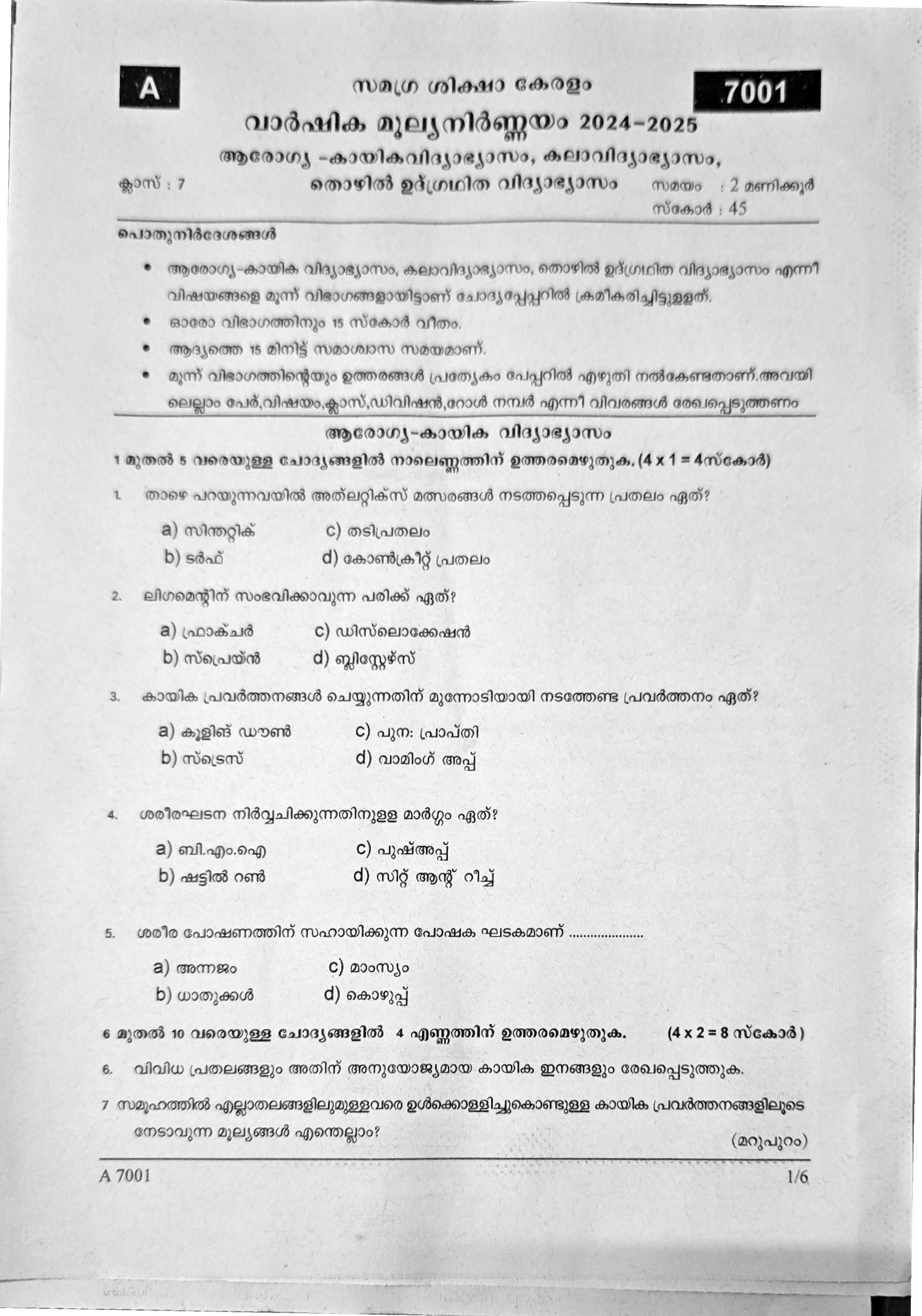 Kerala Class 7 Health and Physical Education, Art Education, Work Education Question Paper 2025