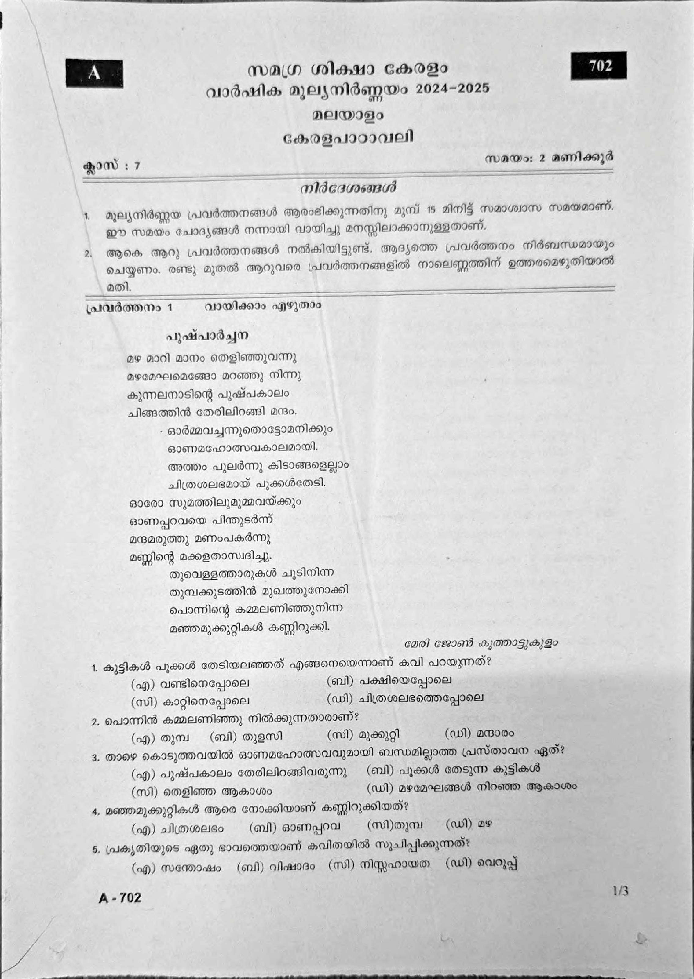 Kerala Class 7 Malayalam I Question Paper 2025 PDF