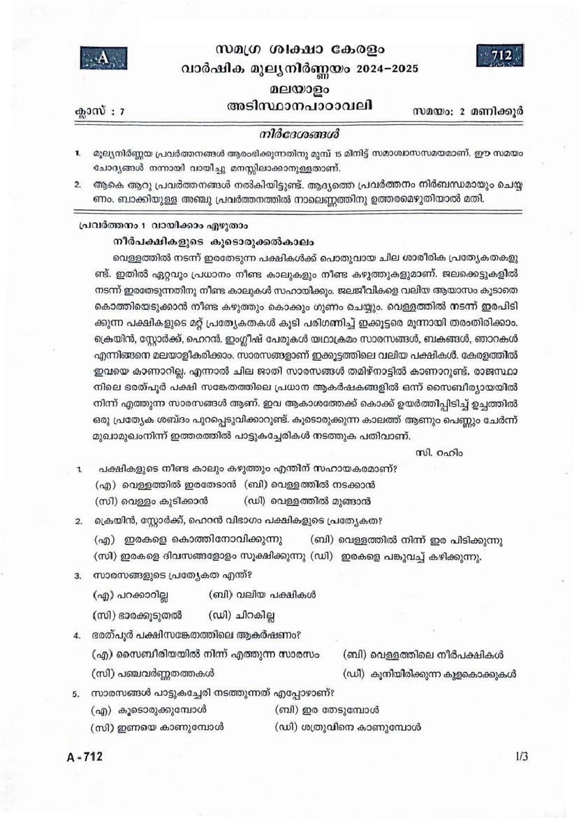 Kerala Class 7 Malayalam II Question Paper 2025 Download Link – Click Here to Download Question Paper PDF
