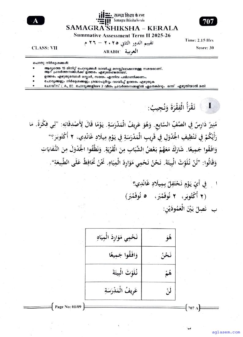 Kerala Class 7 Second Term Question Paper 2025 Arabic View Download