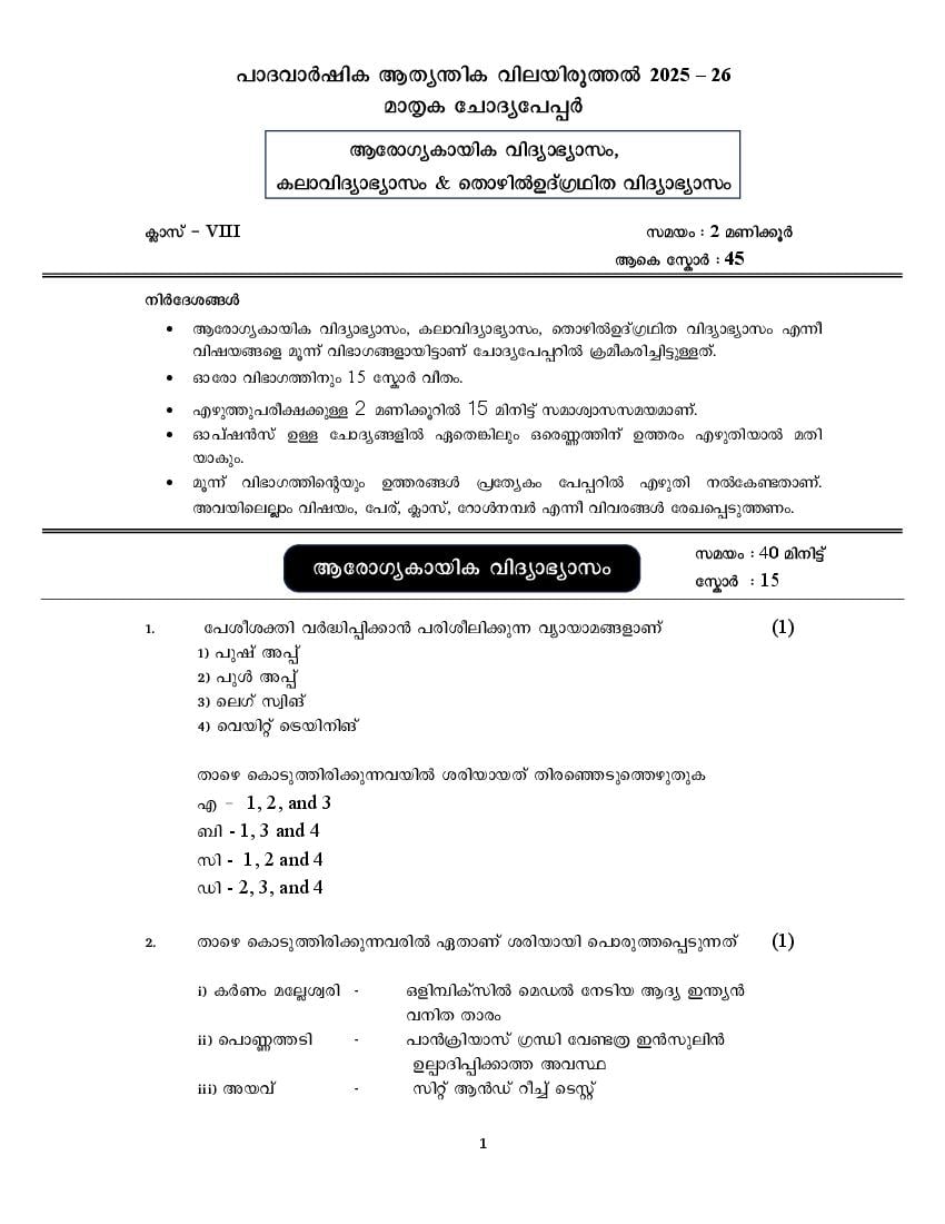 This is the latest model question paper for Std 8 Health & Physical Education, Art Education, and Work Integrated Education Onam Exam 2026. Students should practice this paper to get familiar with the exam format.