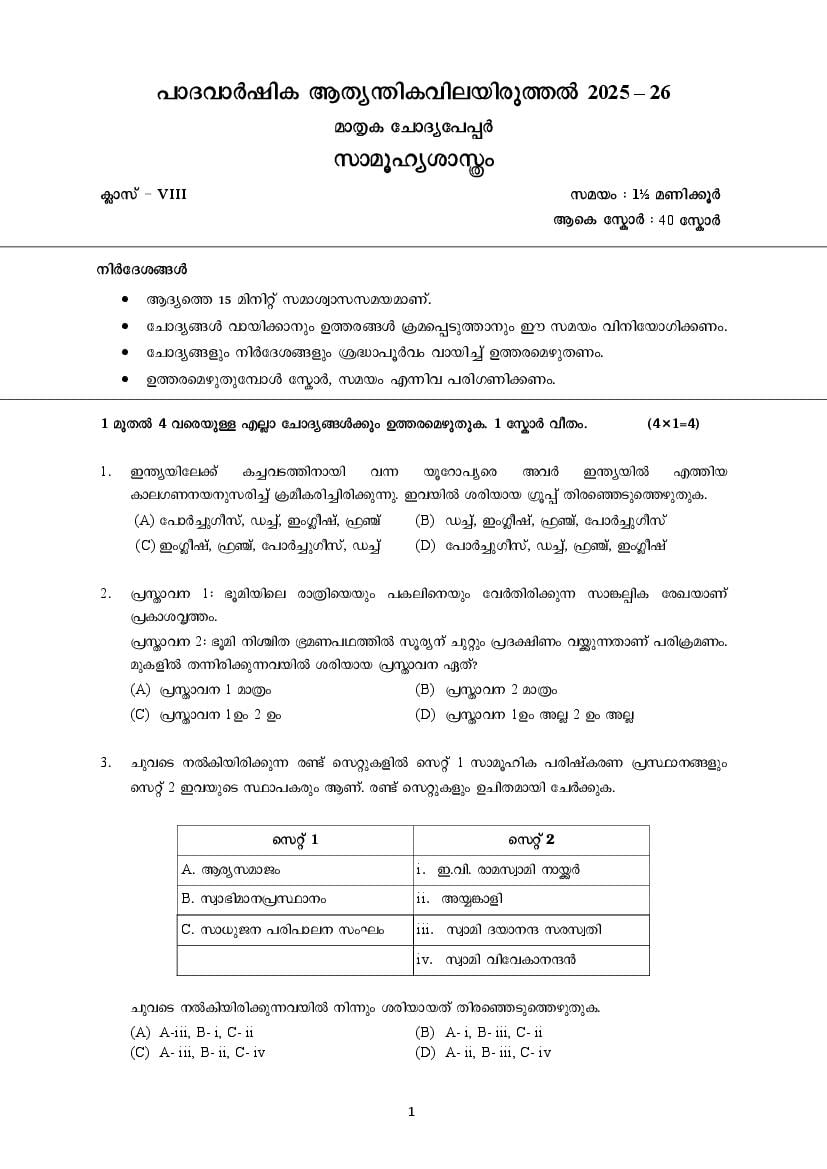 Note: This is a model paper for practice. For actual previous year papers, check Kerala Class 8 Onam Exam Question Papers & Christmas Exam Question Papers.
