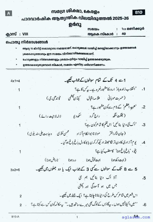 Class 8 Urdu Onam Exam Question Paper 2026 is published after exam. You can download the Kerala Std 8 First Term Urdu Question Paper PDF from here on aglasem. The latest and previous year question paper of Onam Exam for class 8 Urdu helps you prepare for the upcoming first term Urdu test. And after studying with this Kerala Syllabus 8th Standard Urdu Question Paper, you can download Onam Exam Question Paper for Class 8 for other subjects as well.