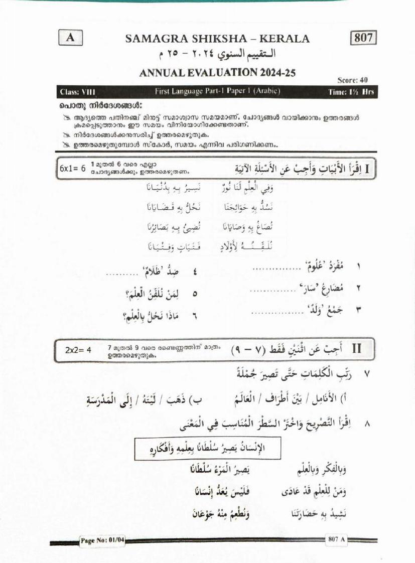 Kerala Class 8th Question Paper 2025 Arabic View Download