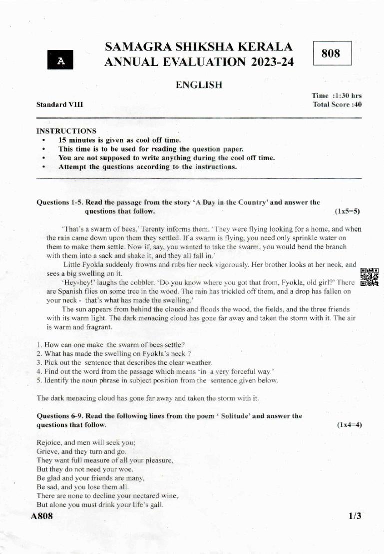 Kerala Class 8 English Question Paper 2024 Download Link – Click Here to Download Question Paper PDF