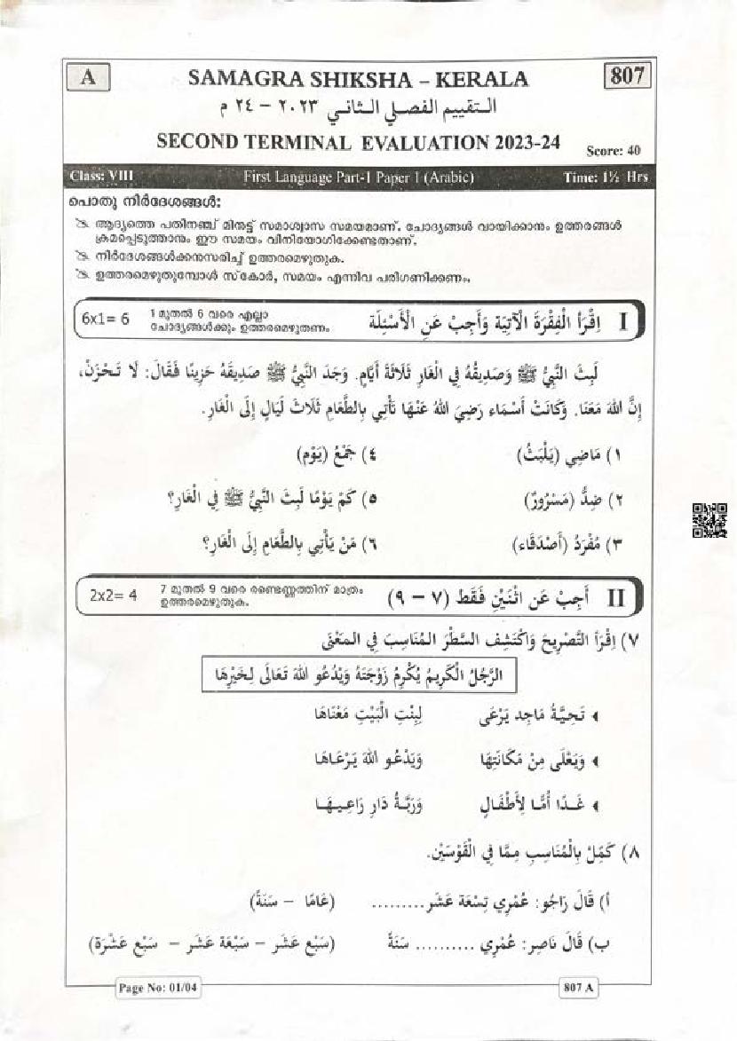 Kerala Class 8 Second Term Question Paper 2023 Arabic View Download