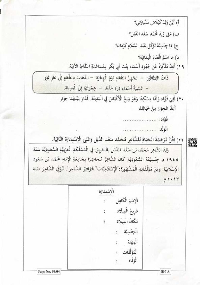 Class 8 Arabic Christmas Exam Question Paper 2024