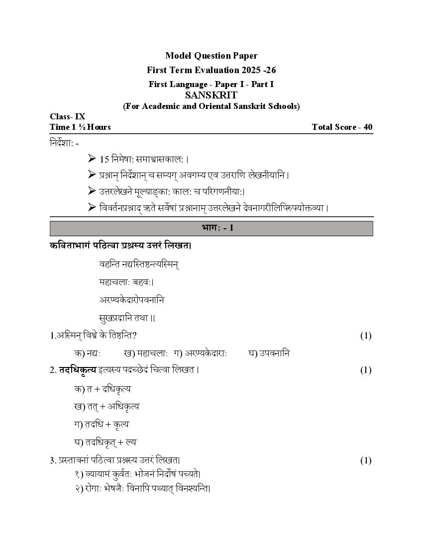 Kerala Class 9 First Term Model Question Paper 2025 Sanskrit View Download