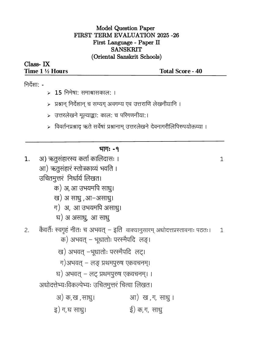 Students can download the Class 9 Sanskrit First Term Exam Model Question Paper 2026 PDF and practice regularly to improve their exam performance.