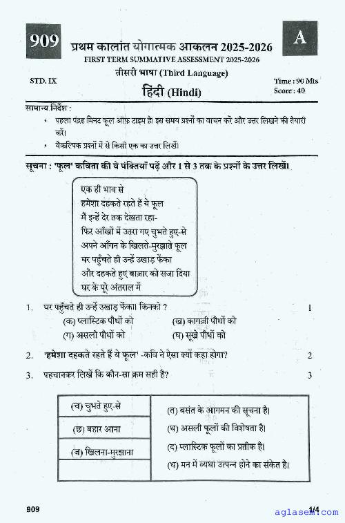 Class 9 Hindi Onam Exam Question Paper 2026 is published after exam. You can download the Kerala Std 9 First Term Hindi Question Paper PDF from here on aglasem. The latest and previous year question paper of Onam Exam for class 9 Hindi helps you prepare for the upcoming first term Hindi test. And after studying with this Kerala Syllabus 9th Standard Hindi Question Paper, you can download Onam Exam Question Paper for Class 9 for other subjects as well.