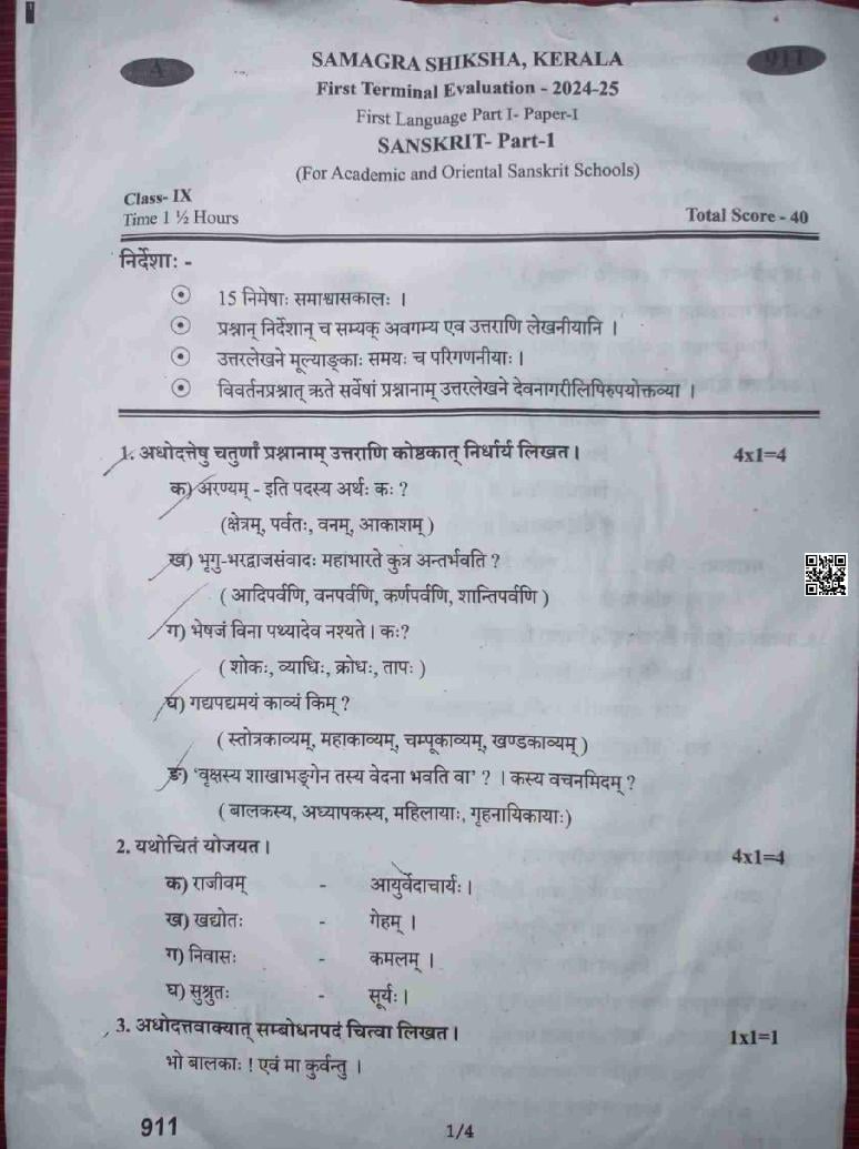| Paper Here | Kerala Class 9 First Terminal Exam Sanskrit Question Paper |