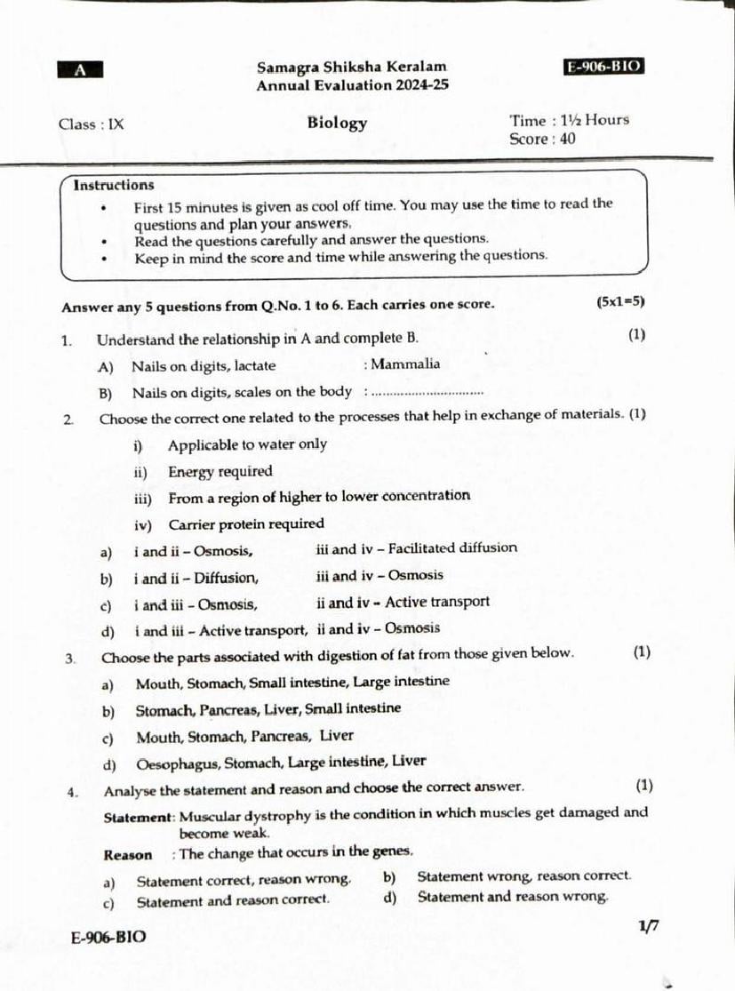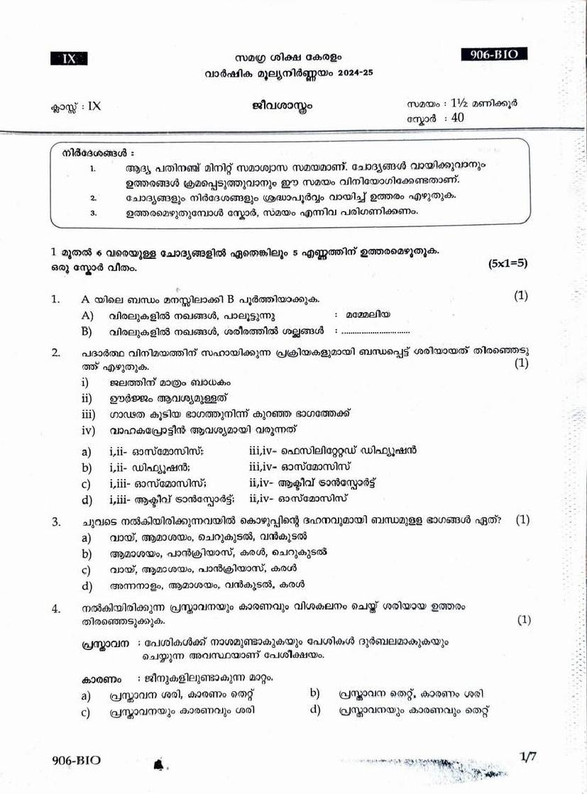 Kerala Class 9 Biology Question Paper 2025