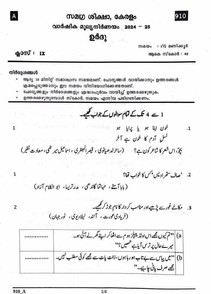 Kerala Class 9 Urdu Question Paper 2025