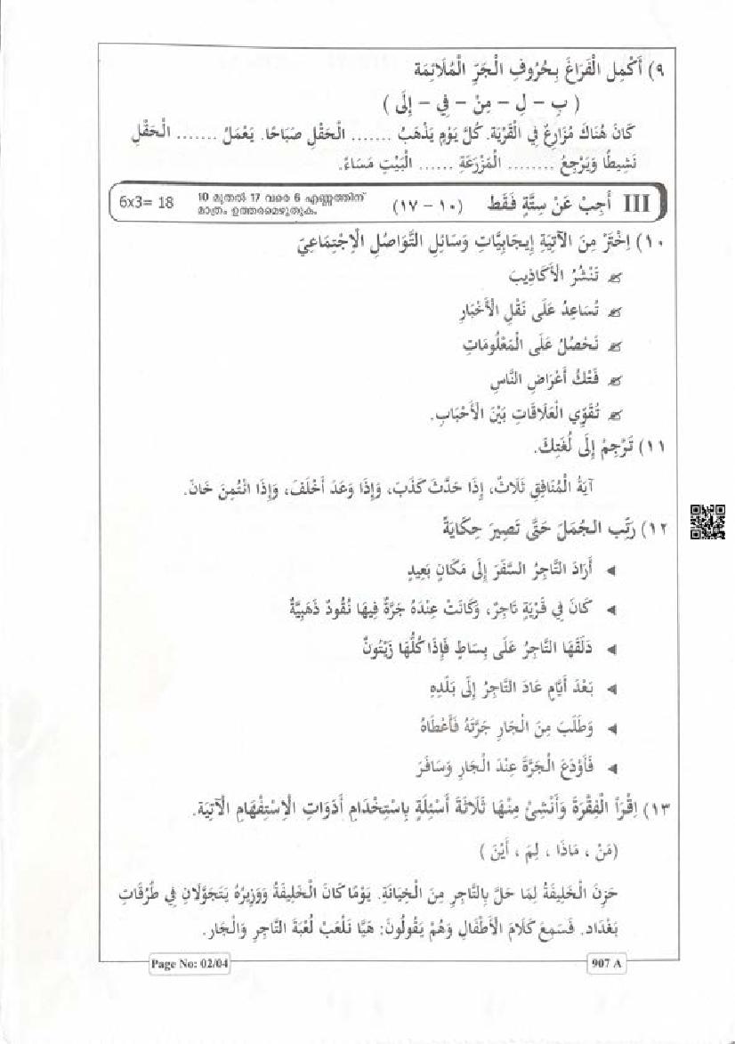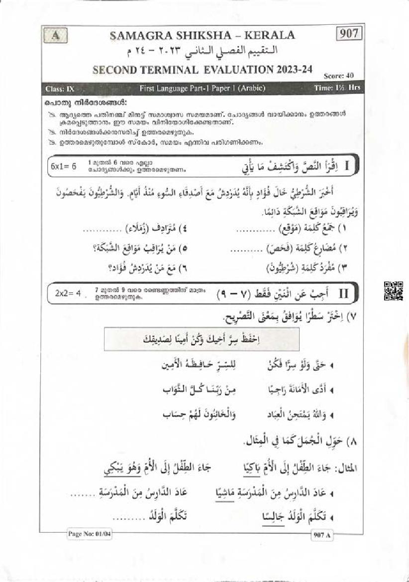 Kerala Class 9 Second Term Question Paper 2023 Arabic View Download