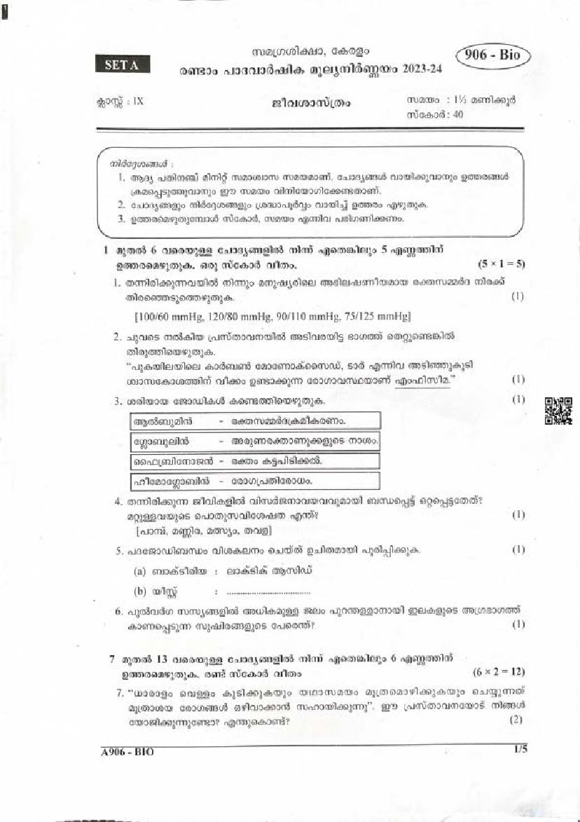 Kerala Class 9 Second Term Question Paper 2023 Biology View Download