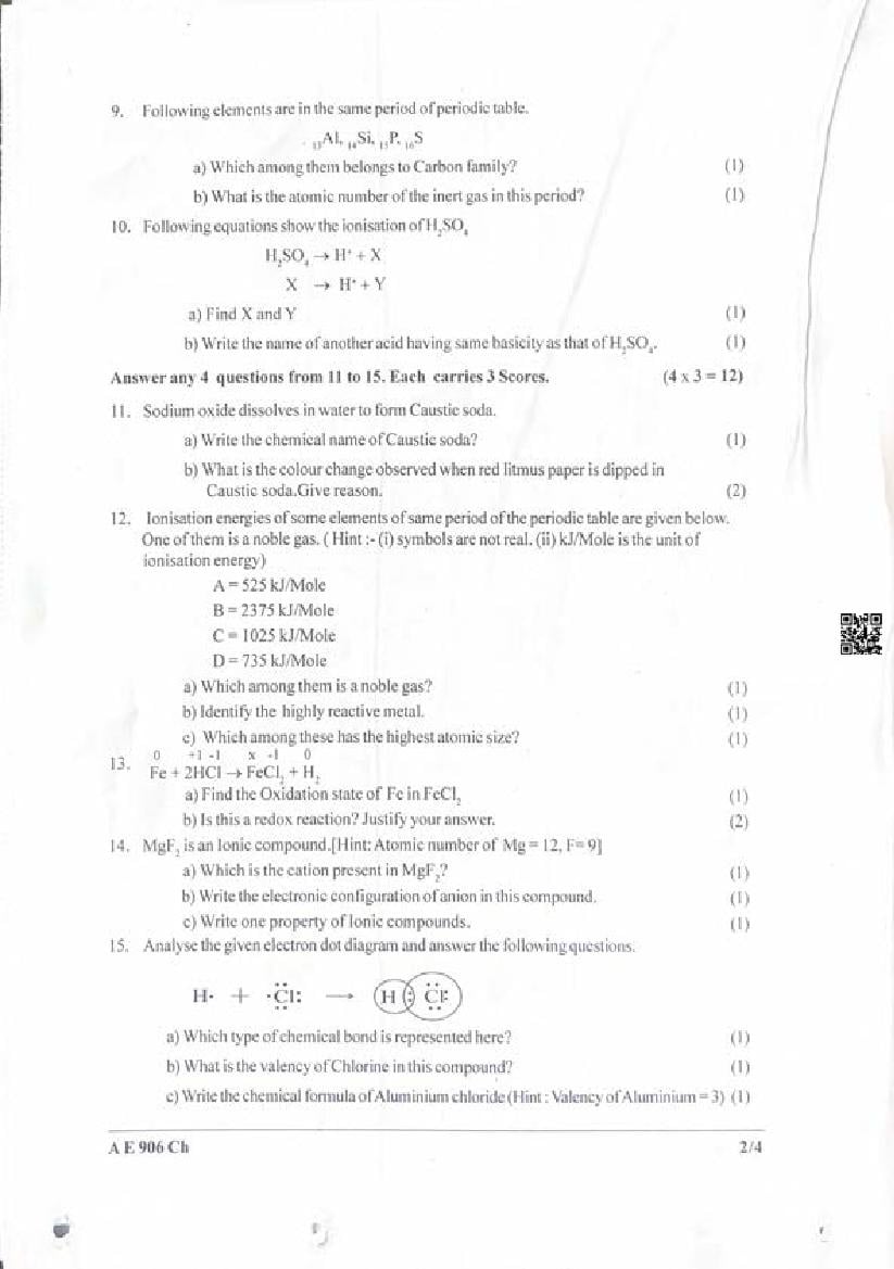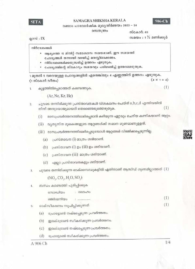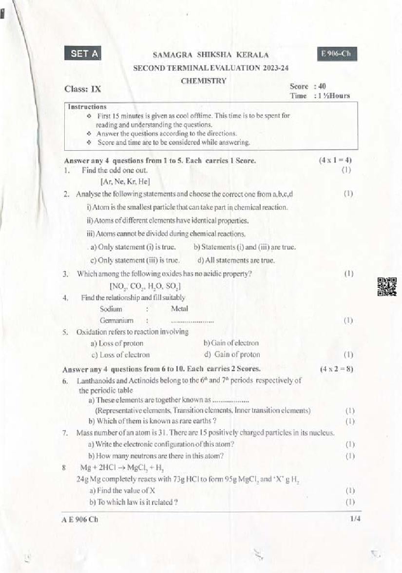 Kerala Class 9 Second Term Question Paper 2023 Chemistry View Download