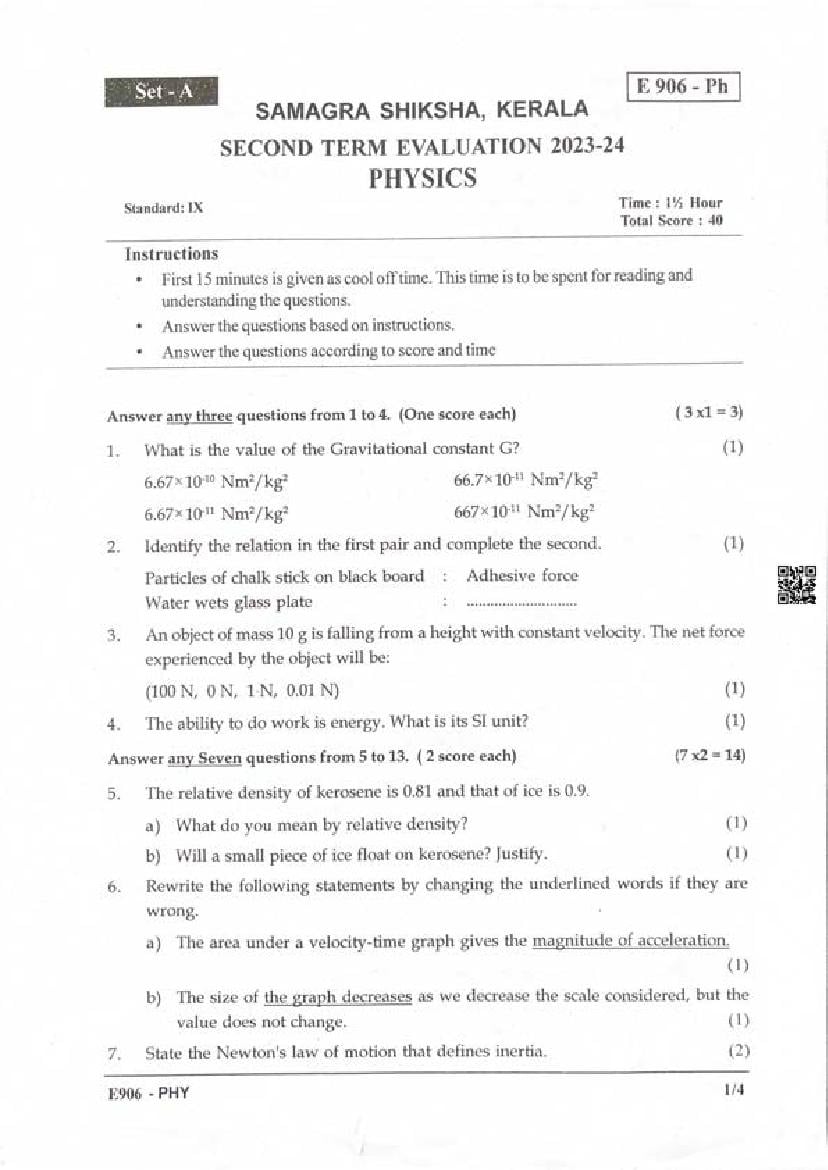 Kerala Class 9 Second Term Question Paper 2023 Physics View Download