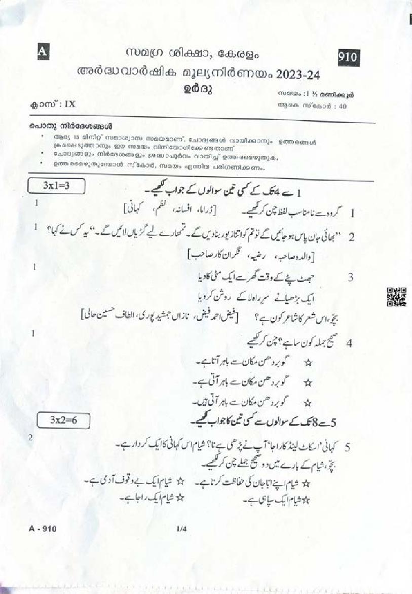 | Paper Here | Kerala Class 9 Second Terminal Exam Urdu Question Paper |